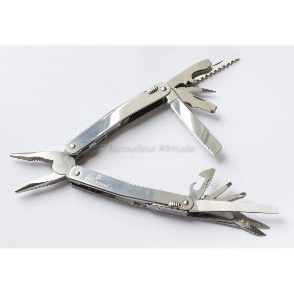 Lame mixte, ouvre-boîtes, tournevis-décapsuleur, poinçon, scie à métaux, scie à bois, petit tournevis, ciseaux à bois, tournevis cruciforme, ciseaux, pince multi-usages.