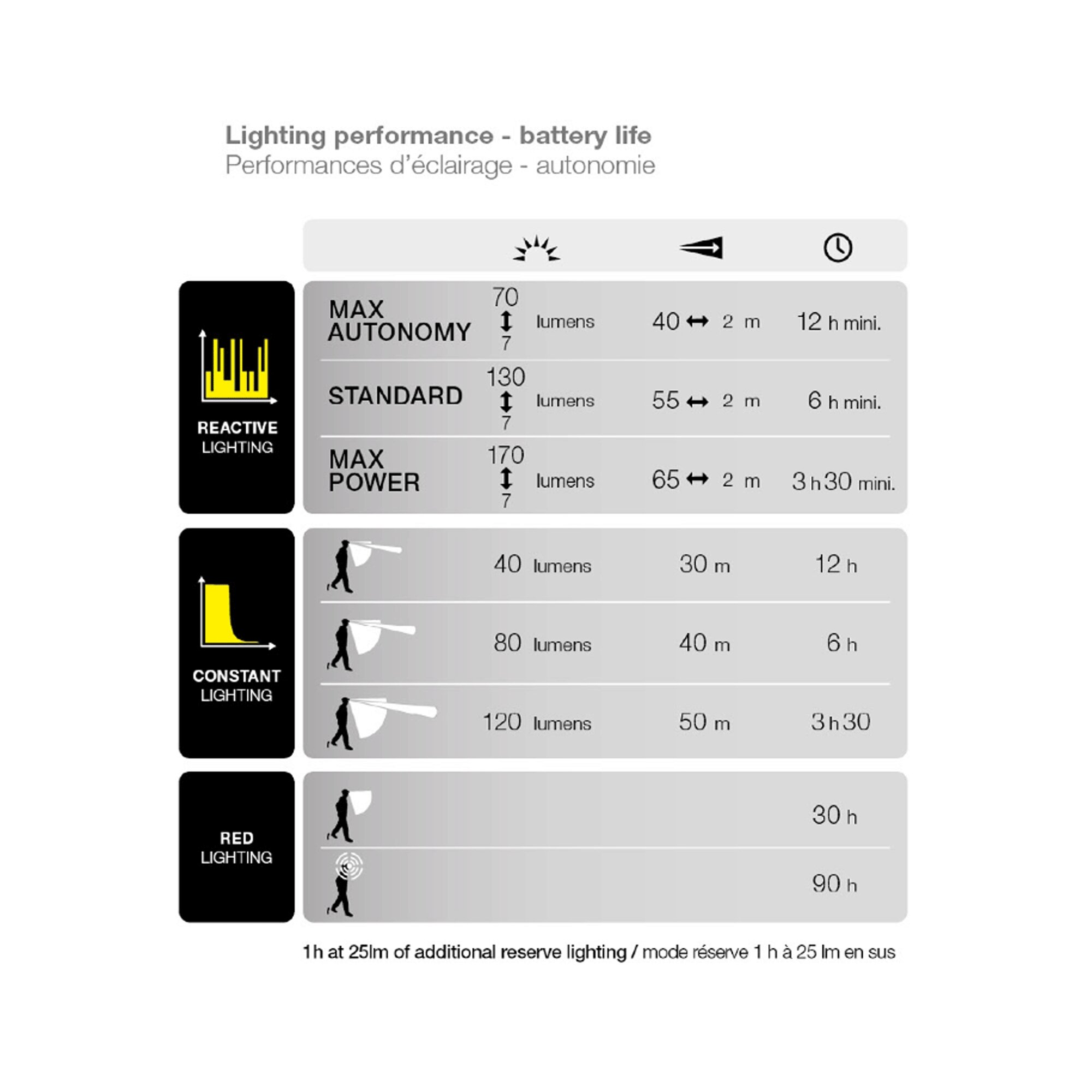 Témoin de charge et décharge avec une autonomie d’1 heure en mode réserve avec une puissance de 25 lumens.