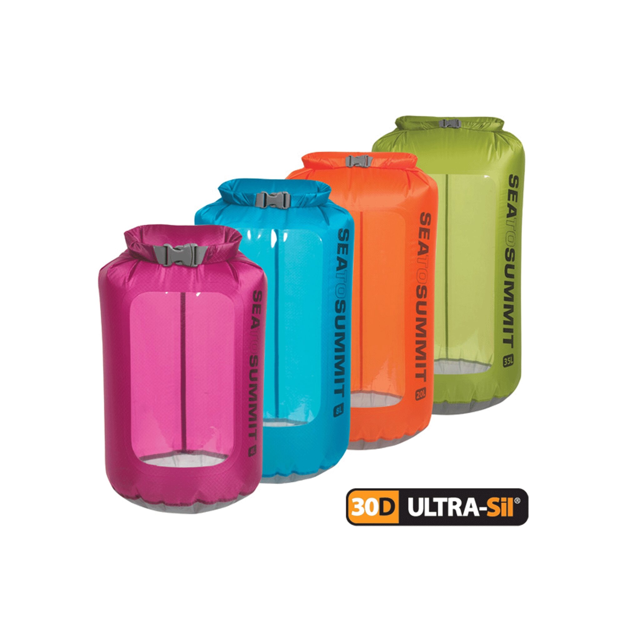 Les Dry Sacks UltraSil® View de Sea sont des sacs étanches offrant une large fenêtre en TPU pour voir le contenu sans avoir à l'ouvrir.