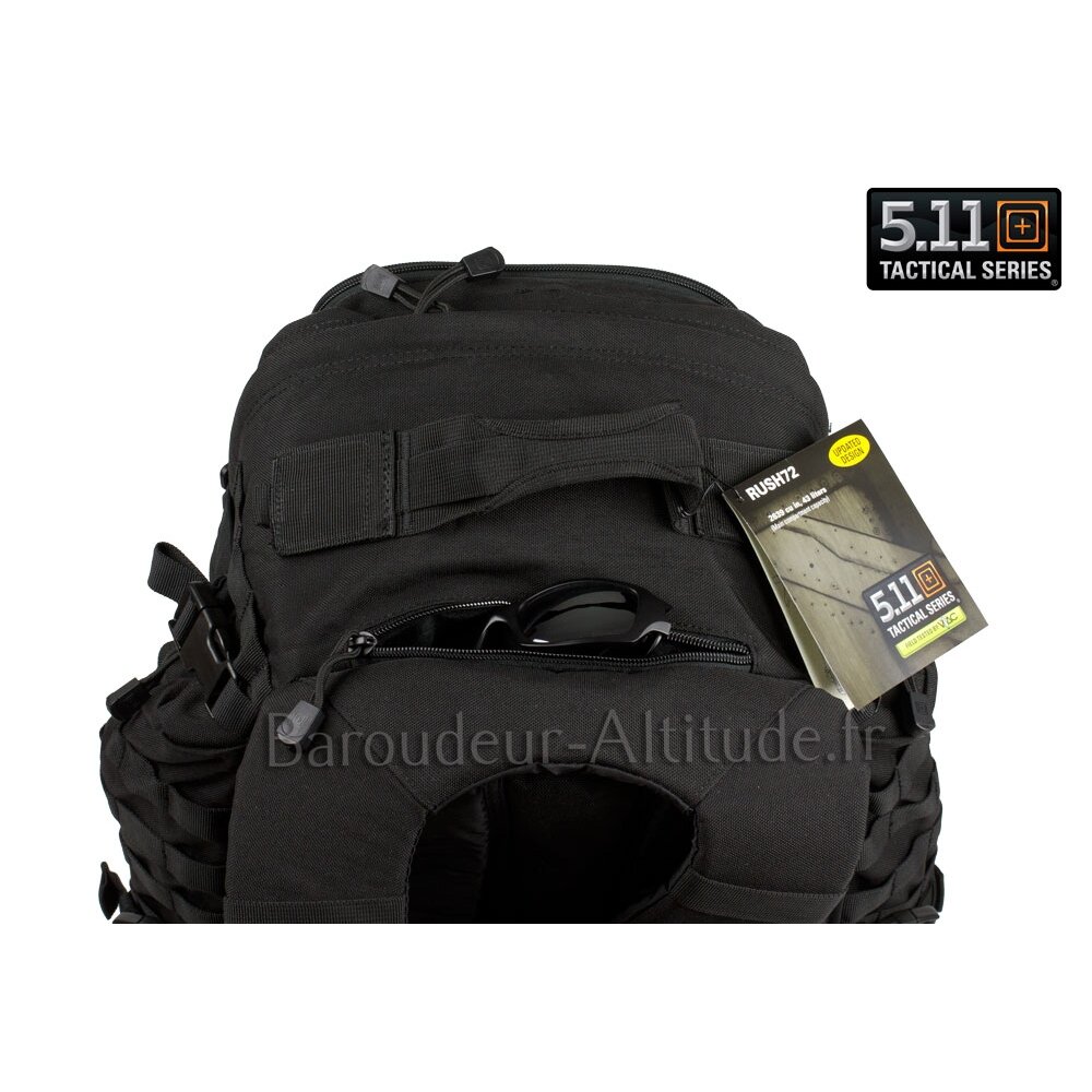 Le sac à dos RUSH 72 contient de multiples compartiments pour une excellente organisation dans un volume total de 47,5 litres. Il possède des bretelles et un dos confortables. Il offre la possibilité de glisser une poche à eau dans un compartiment accessible à l’extérieur du sac. Il offre également une poche doublée de laine polaire pour les lunettes ou autre accessoire fragile située sur le dessus. Il est équipé du système de fixation universel MOLLE permettant d’adapter des poches additionnelles ou des accessoires adaptés, sur les côtés et le devant. Il est également doté de sangles de compression pour une meilleure stabilité.