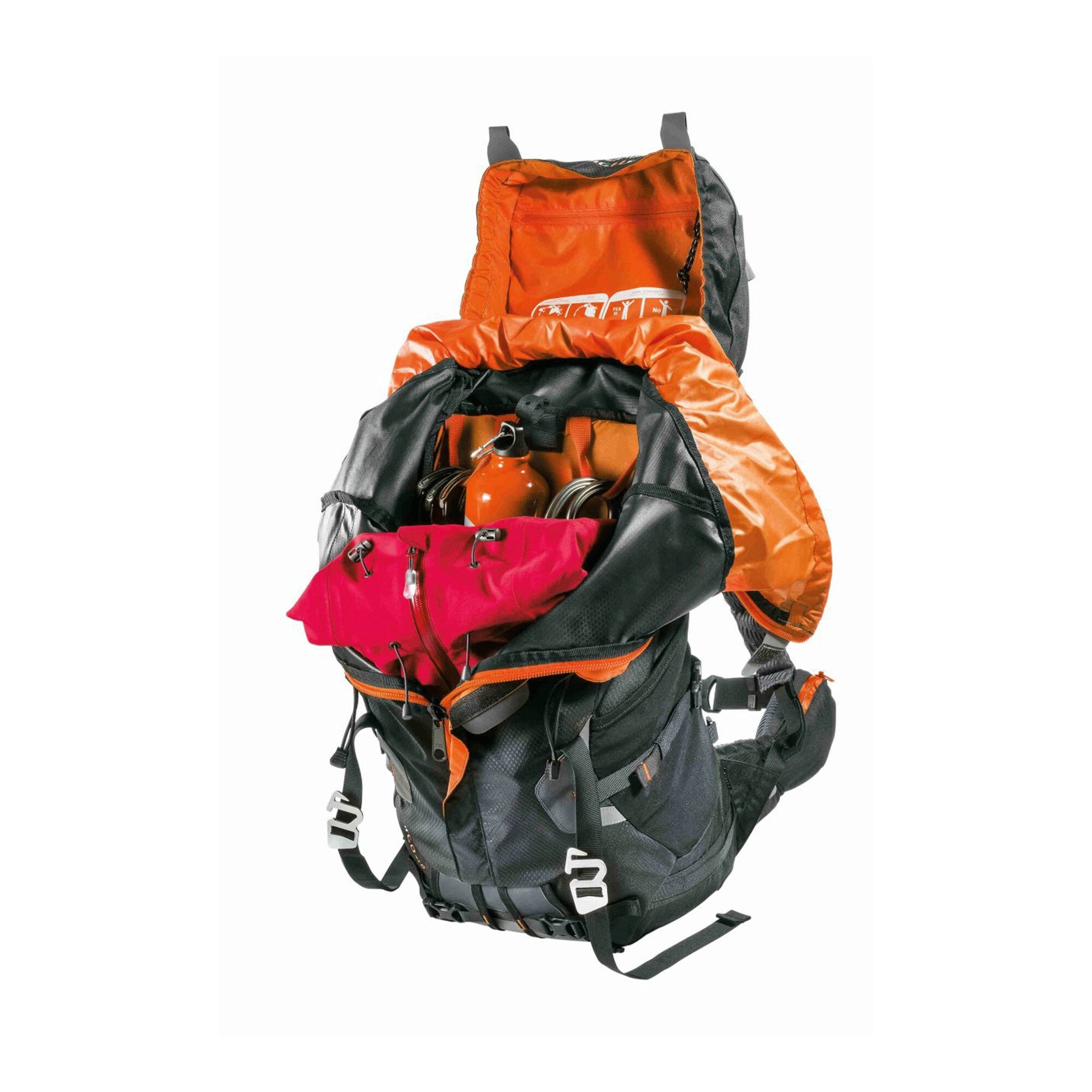 Le sac à dos XMT 60+10 est doté de deux poches filer sur les côtés, de deux poches sur la capuche, d’une poche de sécurité avec un crochet pour y mettre des clefs et d’une poche sur la ceinture.